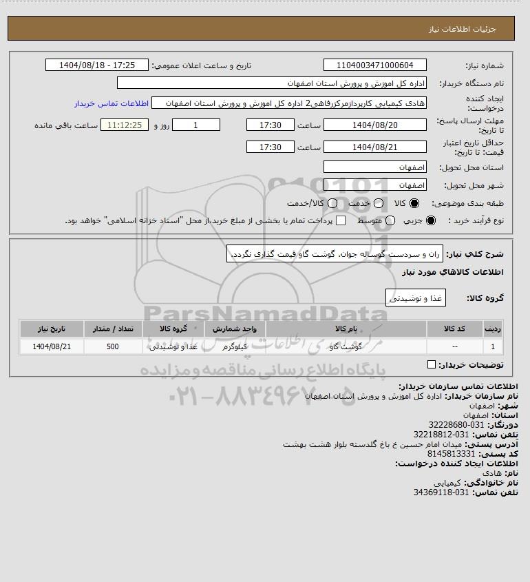 شرح کلی نیاز: ران و سردست گوساله جوان. گوشت گاو قیمت گذاری نگردد.
