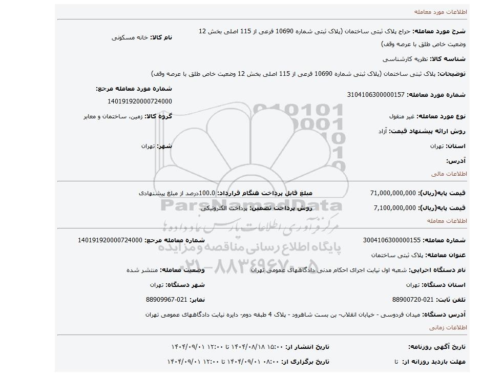 مزایده پلاک ثبتی ساختمان (پلاک ثبتی شماره 10690 فرعی از 115 اصلی بخش 12 وضعیت خاص طلق با عرصه وقف) ؟