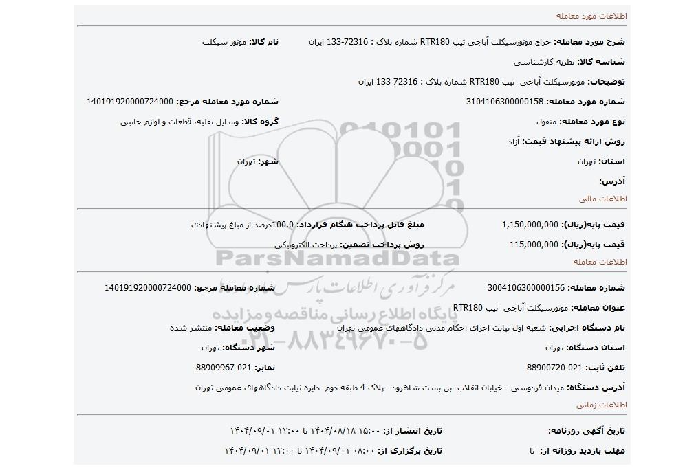 مزایده عمومی مزایده موتورسیکلت آپاچی  تیپ RTR180 شماره پلاک : 72316-133 ایران برگزار میگردد. از کلیه افراد متخصص و شرکت‌های واجد شرایط دعوت به عمل می‌آید تا در این مزایده با کد خبرگزاری پارس نماد : 9824098 شرکت نمایند تاریخ شروع مزایده : 1404/08/18 مهلت شرکت در مزایده: تا پایان روز 1404/09/01 مکان برگزاری اموال واگذاری استان‌های مزایدات استان تهران و دسته‌بندی‌های مربوط به این حراجی موتور سیکلت میباشد.