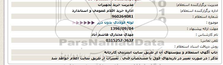 استعلام بها و موضوع استعلام استعلام , استعلام لوله فولادی بدون درز به اطلاع کلیه شرکتها و افراد متخصص واجد شرایط میرساند، آگهی گذار در نظر دارد از طریق استعلام بها، نسبت به انتخاب و دریافت پیشنهادات اقدام نماید. این استعلام با کد آگهی ثبت شده در سامانه خبرگزاری پارس نماد : 982479 منتشر شده است. مشخصات استعلام : تاریخ شروع استعلام: 1396/09/02 آخرین مهلت ارسال پیشنهاد قیمت : 1396/09/04 و محل اجرای پروژه : استان اصفهان میباشد. استعلام قیمت مورد درخواست : استعلام , استعلام لوله فولادی بدون درز با دستهبندیهای تخصصی و گروه های مرتبط : لوله و اتصالات, لوله های فولادی و چدنی, استعلام اطلاع رسانی میگردد.