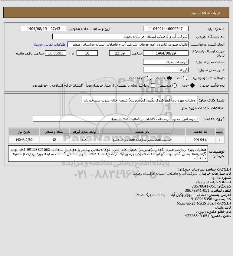 شرح کلی نیاز: عملیات بهره برداری،راهبری،نگهداری(مدیریت) تصفیه خانه شرب شهرقوچان