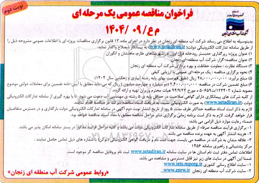 شرکت آب منطقه ای زنجان در نظر دارد در اجرای ماده 13 قانون برگزاری مناقصات پروژه ای با اطلاعات عمومی مشروحه ذیل را از طریق سامانه تدارک الکترونیک دولت سایت ستاد ایران به پیمانکار ذیصلاح واگذار نماید :