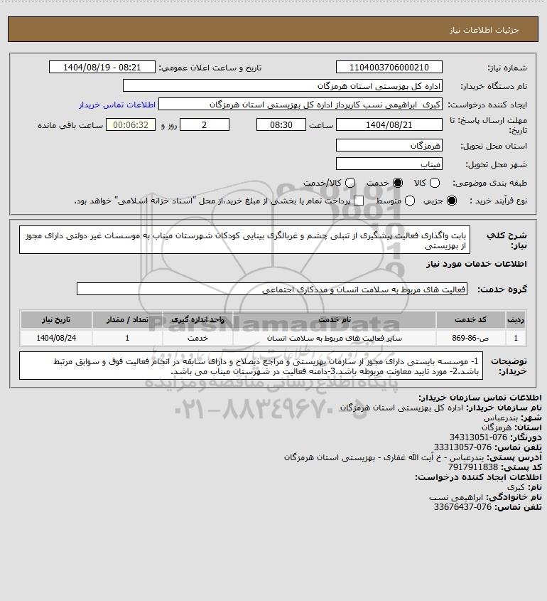 شرح کلی نیاز: بابت واگذاری فعالیت پیشگیری از تنبلی چشم و غربالگری بینایی کودکان شهرستان میناب به موسسات غیر دولتی دارای مجوز از بهزیستی