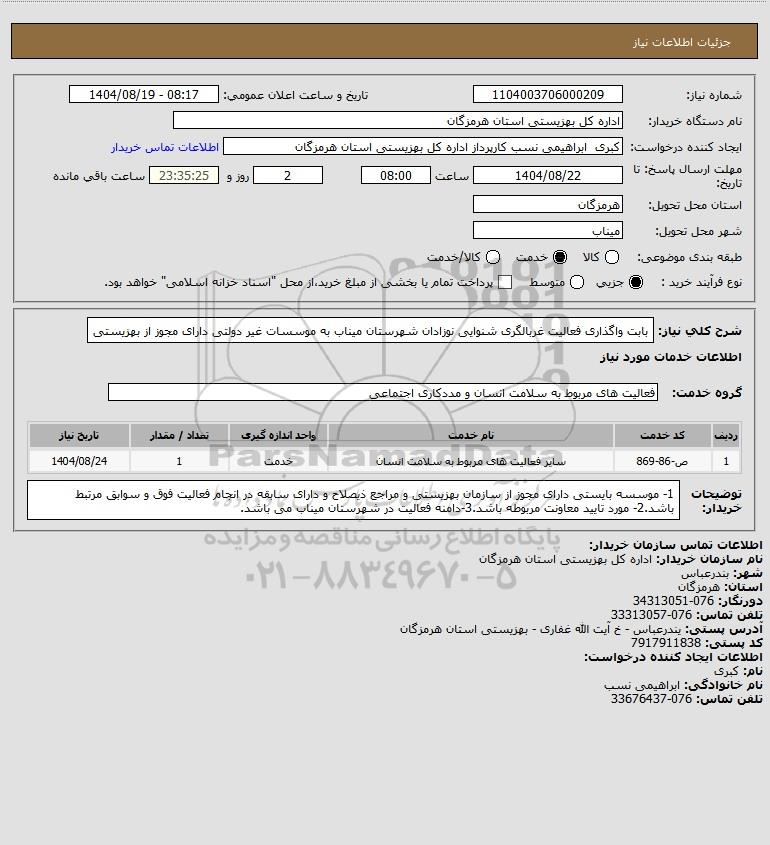 شرح کلی نیاز: بابت واگذاری فعالیت غربالگری شنوایی نوزادان شهرستان میناب به موسسات غیر دولتی دارای مجوز از بهزیستی