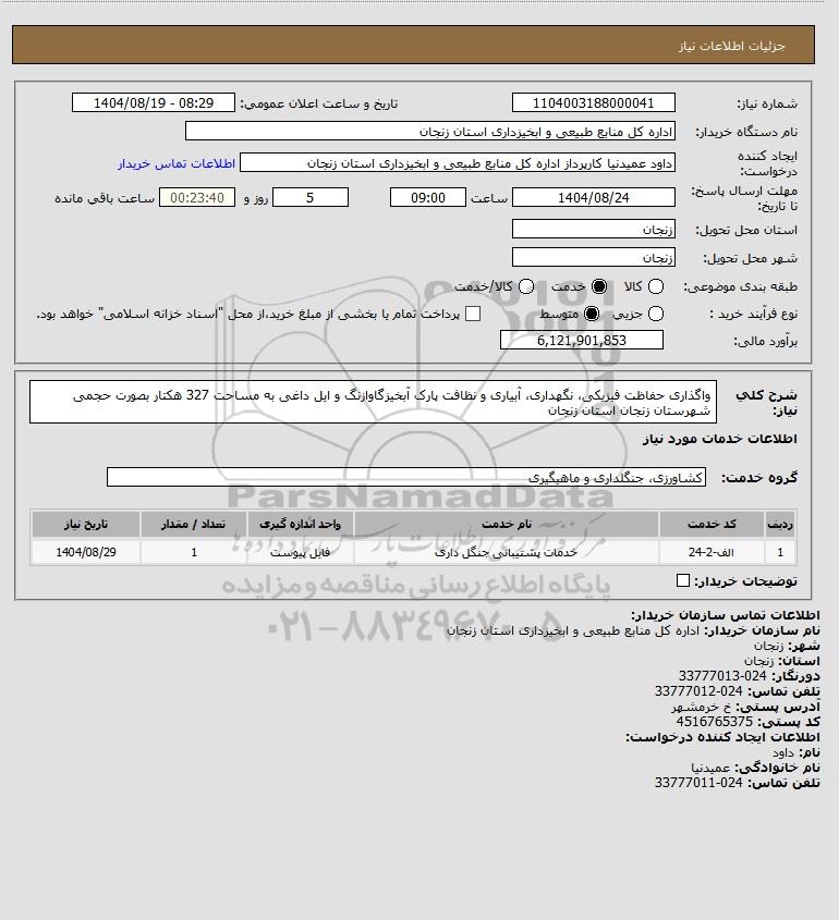 شرح کلی نیاز: واگذاری حفاظت فیزیکی، نگهداری، آبیاری و نظافت پارک آبخیزگاوازنگ و ایل داغی به مساحت 327 هکتار بصورت حجمی شهرستان زنجان استان زنجان