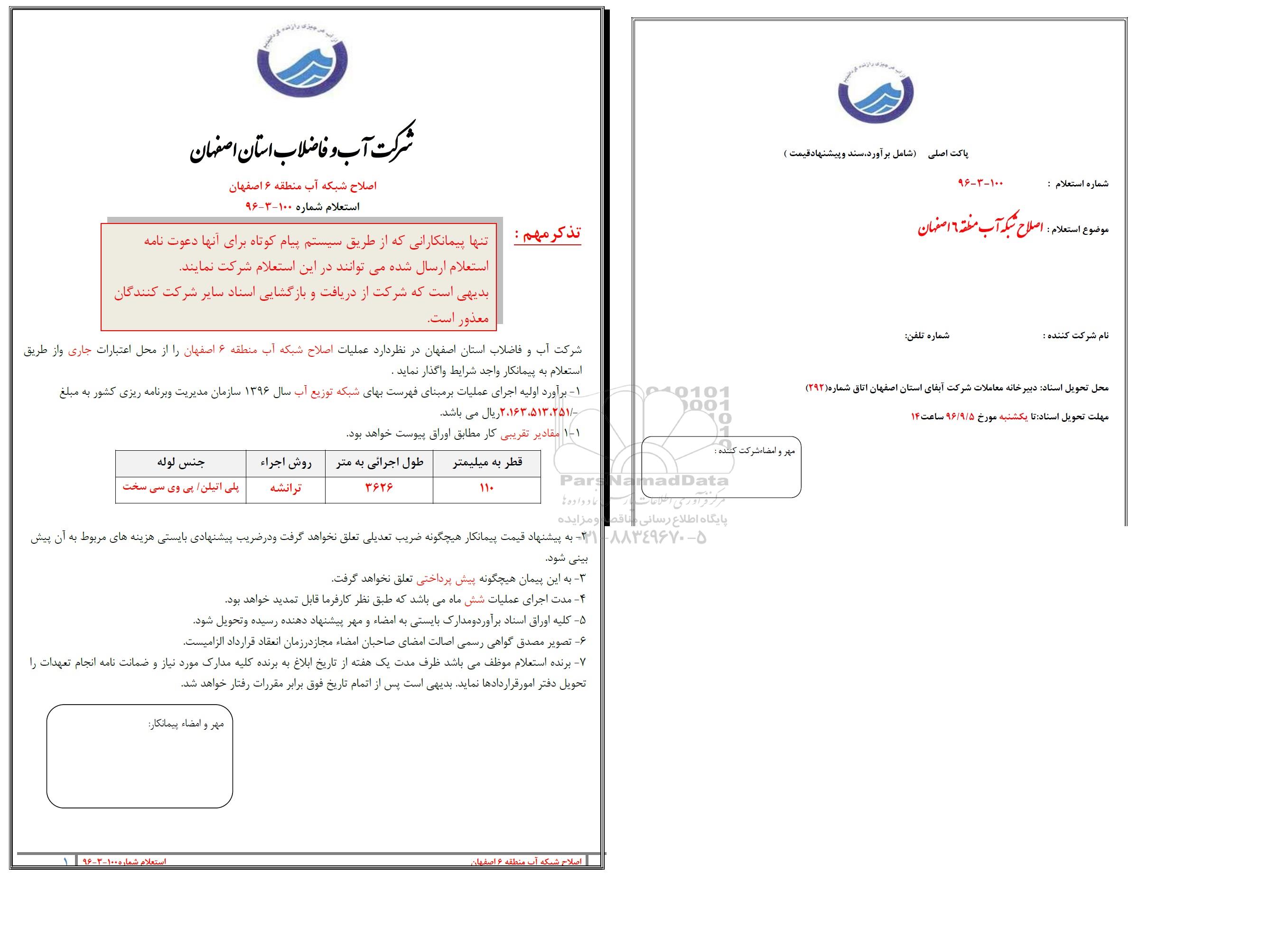 شرکت آب و فاضلاب استان اصفهان در نظر دارد اصلاح شبکه آب منطقه 6 اصفهان را از محل اعتبارات جاری و از طریق استعلام به پیمانکار واجد شرایط واگذار نماید