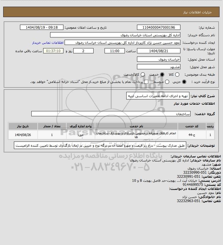شرح کلی نیاز: تهیه و اجرای ادامه تعمیرات اساسی ابنیه