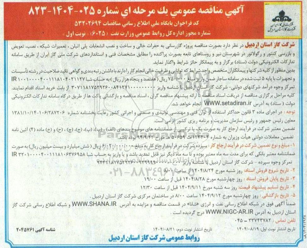 شرکت گاز استان اردبیل در نظر دارد بصورت مناقصه پروژه گازرسانی به حفرات خالی و ساخت و نصب انشعابات پلی اتیلن ، تعمیرات شبکه ، نصب، تعویض و بازرسی کنتور و رگولاتور در شهرستان نیر و روستاهای تابعه بصورت پراکنده را مطابق مشخصات فنی و استانداردهای شرکت ملی گاز ایران از طریق سامانه تدارکات الکترونیکی دولت (ستاد) برگزار و به پیمانکار حائز شرایط واگذار نماید.