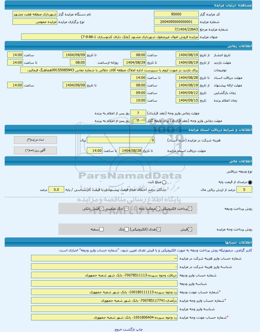 | شماره مال | 2104095000000001 | نوع برگزاری مزایده | مزایده عمومی | |