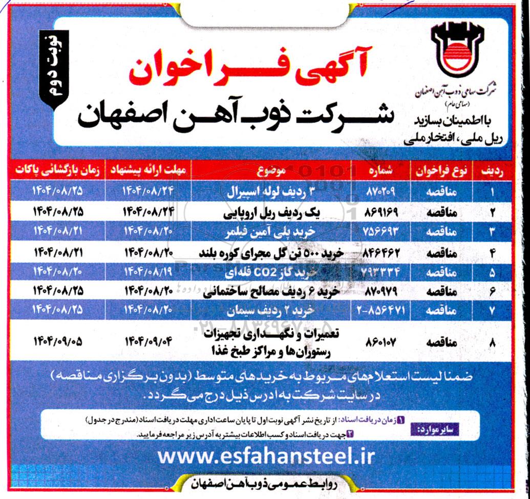 | 1 | مناقصه | 870209 | 3 ردیف لوله اسپیرال | 1404.08.24 | 1404.08.25 |