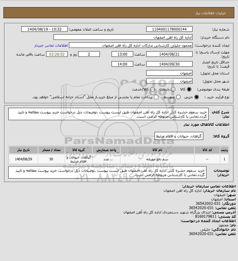 | 1 | -- | سم دفع موریانه | عدد | گیاهان، حیوانات و اقلام مرتبط | 50 | 1404/08/29 |
