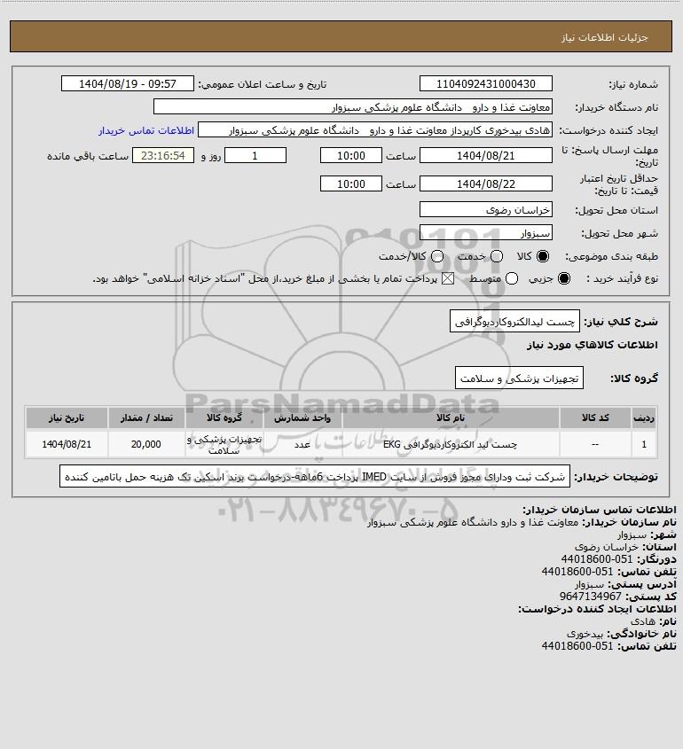 | 1 | -- | چست لید الکتروکاردیوگرافی EKG | عدد | تجهیزات پزشکی و سلامت | 20,000 | 1404/08/21 |