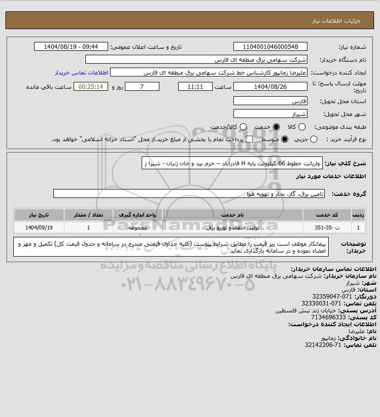 شرح کلی نیاز: واریانت خطوط 66 کیلوولت پایه H قادرآباد – خرم بید و خان زنیان - شیرا ز