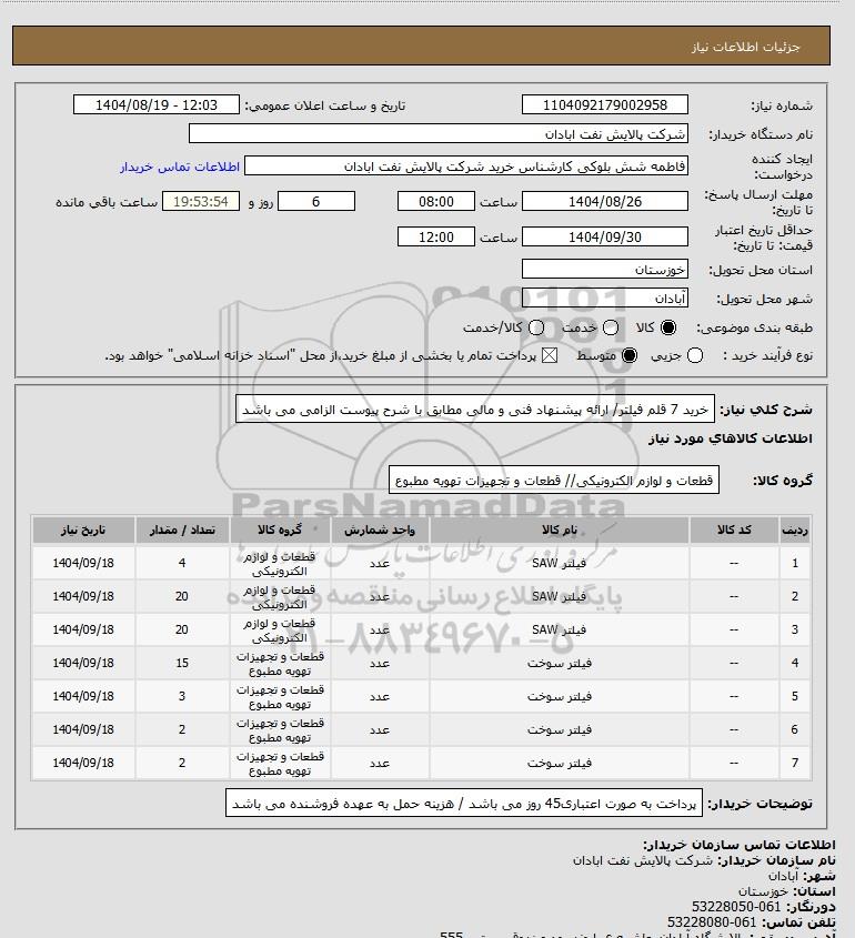 شرح کلی نیاز: خرید 7 قلم فیلتر/ ارائه پیشنهاد فنی و مالی مطابق با شرح پیوست الزامی می باشد
