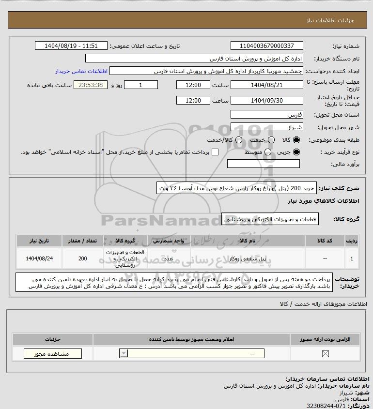 شرح کلی نیاز: خرید 200 (پنل )چراغ روکار پارس شعاع توس مدل آویسا ۳۶ وات