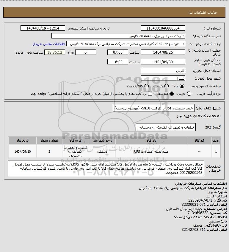 | 1 | -- | منبع تغذیه اضطراری UPS | دستگاه | قطعات و تجهیزات الکتریکی و روشنایی | 2 | 1404/09/10 |