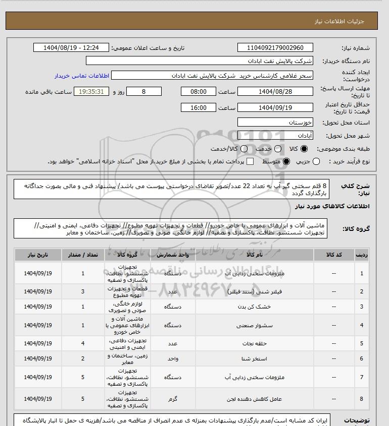 استعلام 8 قلم سختی گیر آب به تعداد 22 عدد/تصویر تقاضای درخواستی پیوست می باشد/ پیشنهاد فنی و مالی بصورت جداگانه بارگذاری گردد, استعلام 8 قلم سختی گیر آب به تعداد 22 عدد/تصویر تقاضای درخواستی پیوست می باشد/ پیشنهاد فنی و مالی بصورت جداگانه بارگذاری گردد
