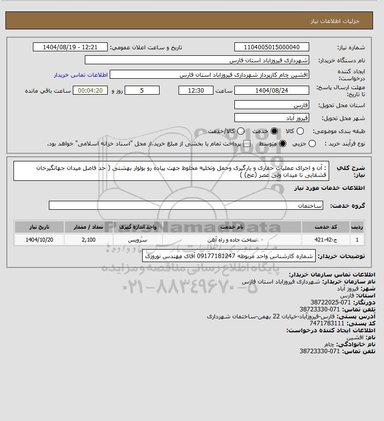 شرح کلی نیاز: : آن و اجرای عملیات حفاری و بارگیری وحمل وتخلیه مخلوط جهت پیاده رو بولوار بهشتی ( حد فاصل میدان جهانگیرخان قشقایی تا میدان ولی عصر (عج) )