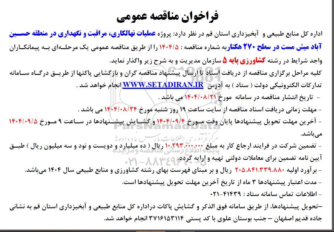 اداره کل منابع طبیعی و آبخیزداری استان قم در نظر دارد پروژه عملیات نهالکاری، مراقبت و نگهداری در منطقه حسین آباد میش مست در سطح 270 هکتار به شماره مناقصه : 1404.5 را از طریق مناقصه عمومی یک مرحله ای به پیمانکاران واجد شرایط در رشته کشاورزی پایه 5 سازمان مدیریت و به شرح زیر واگذار نماید.