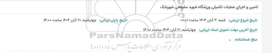 مناقصه تامین و اجرای عملیات تکمیلی ورزشگاه شهید سلیمانی شهربابک - مناقصه روز دوشنبه نوزدهم آبان ماه 1404 از کلیه افراد متخصص و شرکتها واجد شرایط دعوت به عمل میآید در مناقصه با کد خبرگزاری پارس نماد: 9828430 شرکت نمایند.