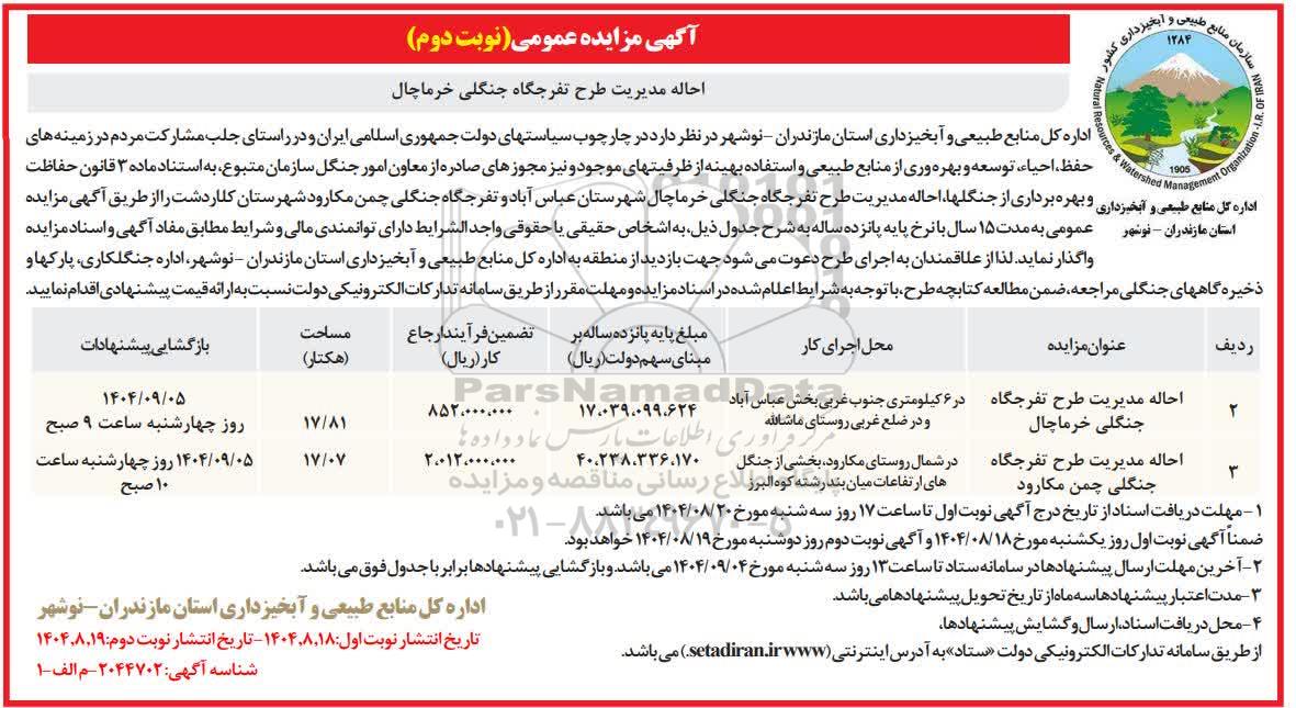 اداره کل منابع طبیعی و آبخیزداری استان مازندران - نوشهر در نظر دارد در چارچوب سیاستهای دولت جمهوری اسلامی ایران و در راستای جلب مشارکت مردم در زمینه های حفظ احیاء، توسعه و بهره وری از منابع طبیعی و استفاده بهینه از ظرفیتهای موجود و نیز مجوز صادره  از معاون امور جنگل سازمان متبوع به استناد ماده 3 قانون حفاظت و بهره برداری از جنگلها و مراتع ، احاله مدیریت طرح تفرجگاه جنگلی خرماچال شهرستان عباس آباد و فرجگاه جنگلی چمن مکارود شهرستان کلاردشت  را از طریق آگهی مزایده عمومی به مدت 15 سال با نرخ پایه پانزده ساله به شرح جدول ذیل به اشخاص حقیقی یا حقوقی واجد الشرایط دارای توانمندی مالی و شرایط مطابق مفاد آگهی و اسناد مزایده واگذار نماید. لذا از علاقمندان به اجرای طرح دعوت می شود جهت بازدید از منطقه به اداره کل منابع طبیعی و آبخیزداری استان مازندران - نوشهر اداره جنگلکاری پارکها و ذخیره گاههای جنگلی مراجعه، ضمن مطالعه کتابچه طرح ، با توجه به شرایط اعلام شده در اسناد مزایده و مهلت مقرر از طریق سامانه تدارکات الکترونیکی دولت نسبت به ارائه قیمت پیشنهادی اقدام نمایید.