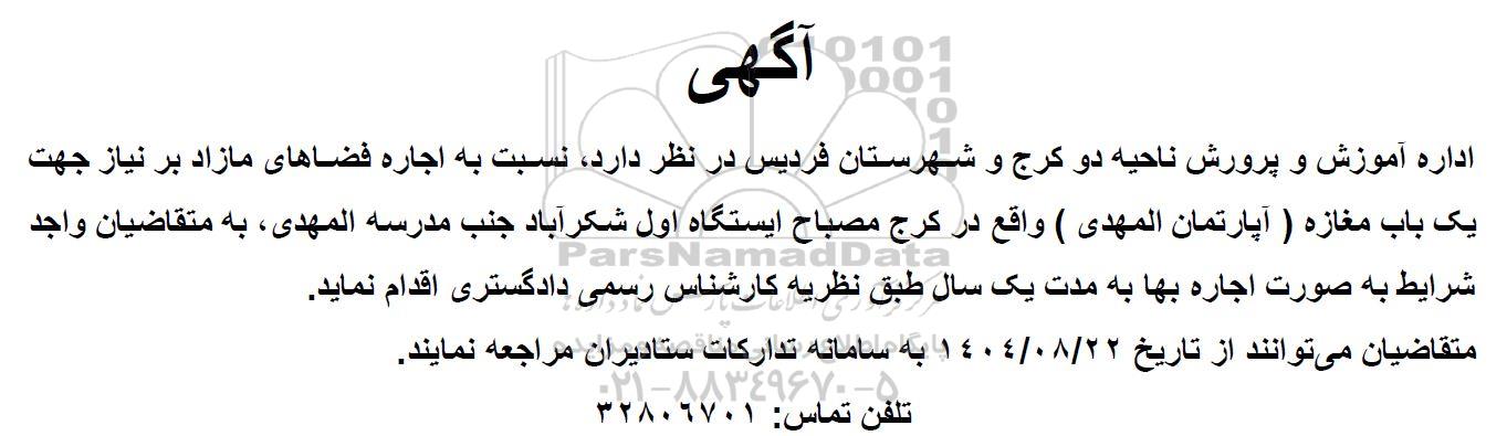 اداره آموزش و پرورش ناحیه دو کرج و شهرستان فردیس در نظر دارد نسبت به اجاره فضاهای مازاد بر نیاز جهت یک باب مغازه (اپارتمان المهدی) واقع در کرج مصباح ایستگاه اول شکر آباد جنب مدرسه المهدی به متقاضیان واجد شرایط به صورت اجاره بها به مدت یک سال طبق نظریه کارشناس رسمی دادگستری اقدام نماید. متقاضیان میتوانند از تاریخ 1404.08.22 به سامانه تدارکات ستادیران مراجعه نمایند.