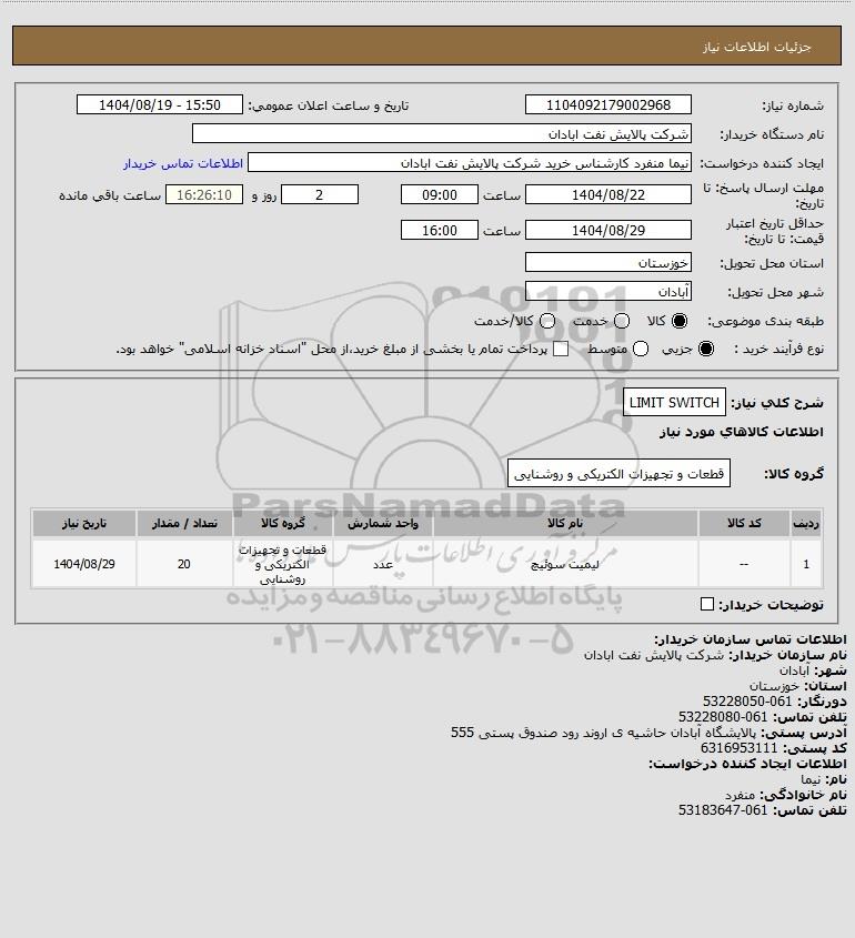 | 1 | -- | لیمیت سوئیچ | عدد | قطعات و تجهیزات الکتریکی و روشنایی | 20 | 1404/08/29 |