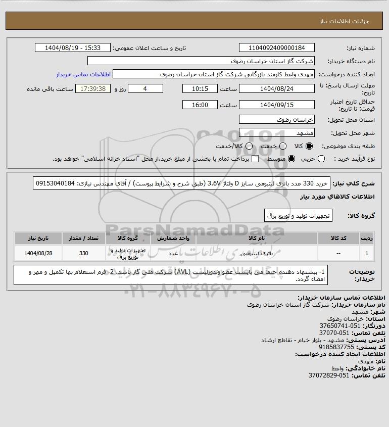 شرح کلی نیاز: خرید 330 عدد باتری لیتیومی سایز D ولتاژ 3.6V (طبق شرح و شرایط پیوست) / آقای مهندس نیازی: 09153040184