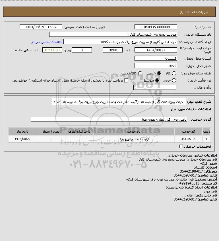 شرح کلی نیاز: اجرای پروژه های گذر از تابستان (7پست)در محدوده مدیریت توزیع نیروی برق شهرستان کلاله