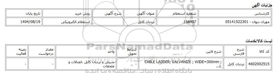 | مهران دیوان - 05141522301 | 166957 | نردبان کابل | استعلام الکترونیکی | 1404/08/19 |