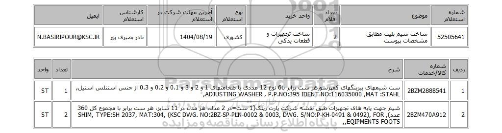 | 52505641 | ساخت شیم پلیت مطابق مشخصات پیوست | 2 | ساخت تجهیزات و قطعات یدکی | کشوری | 1404/08/19 | نادر بصیری پور | N.BASIRIPOUR@KSC.IR |