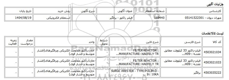 | مهران دیوان - 05141522301 | 169440 | فیلتر راکتور - برقگیر | استعلام الکترونیکی | 1404/08/19 |