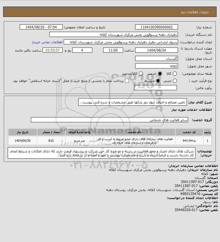 شرح کلی نیاز: تامین مصالح و اجرای دیوار دور پارکها طبق مشخصات و شرح فنی پیوست .