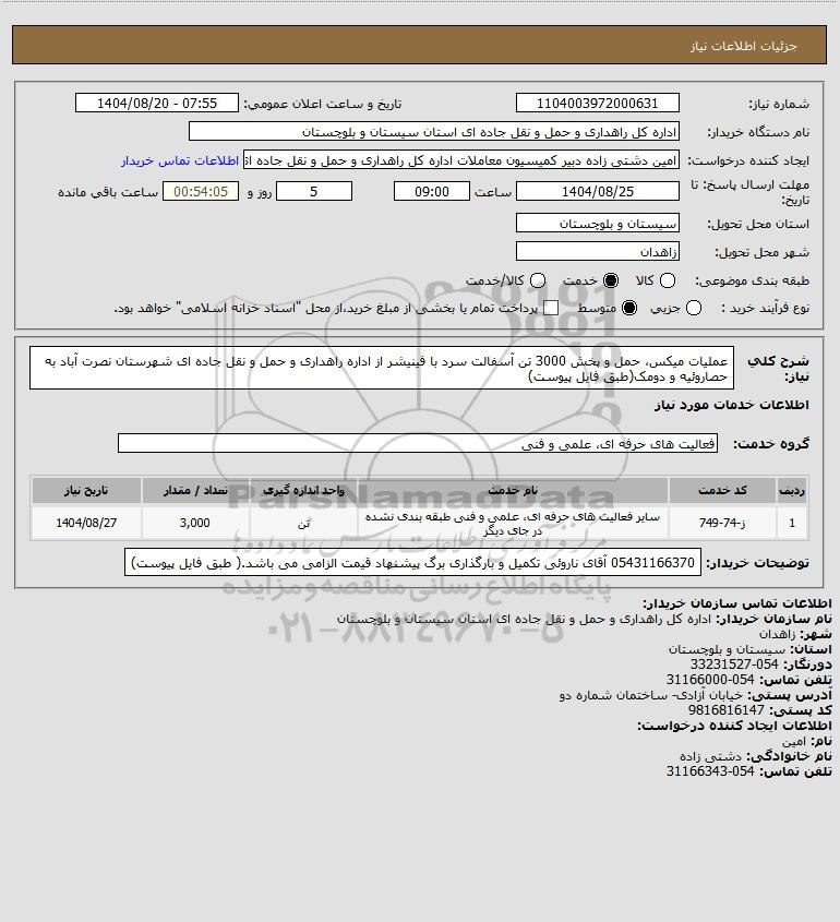 شرح کلی نیاز: عملیات میکس، حمل و پخش 3000 تن آسفالت سرد با فینیشر از اداره راهداری و حمل و نقل جاده ای شهرستان نصرت آباد به حصاروئیه و دومک(طبق فایل پیوست)