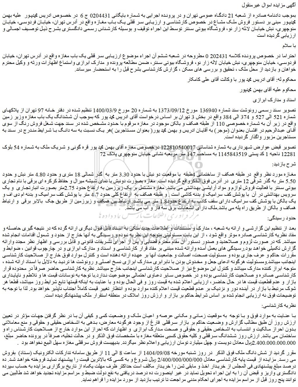 بموجب دادنامه صادره از شعبه 21 دادگاه عمومی تهران و در پرونده اجرایی به شماره بایگانی 0204431 ج 6 در خصوص ادریس محمدپور علیه بهمن محمدپور مبنی بر دستور فروش ملک مشاع در خصوص کارشناسی و ارزیابی سر قفلی یک باب مغازه واقع در آدرس تهران، خیابان فردوسی، خیابان منوچهری، نبش خیابان لاله زار نو، فروشگاه بیوتی سنتر توسط این اجراء توقیف و بوسیله کارشناس رسمی دادگستری بشرح ذیل توصیف اجمالی و ارزیابی گردیده است