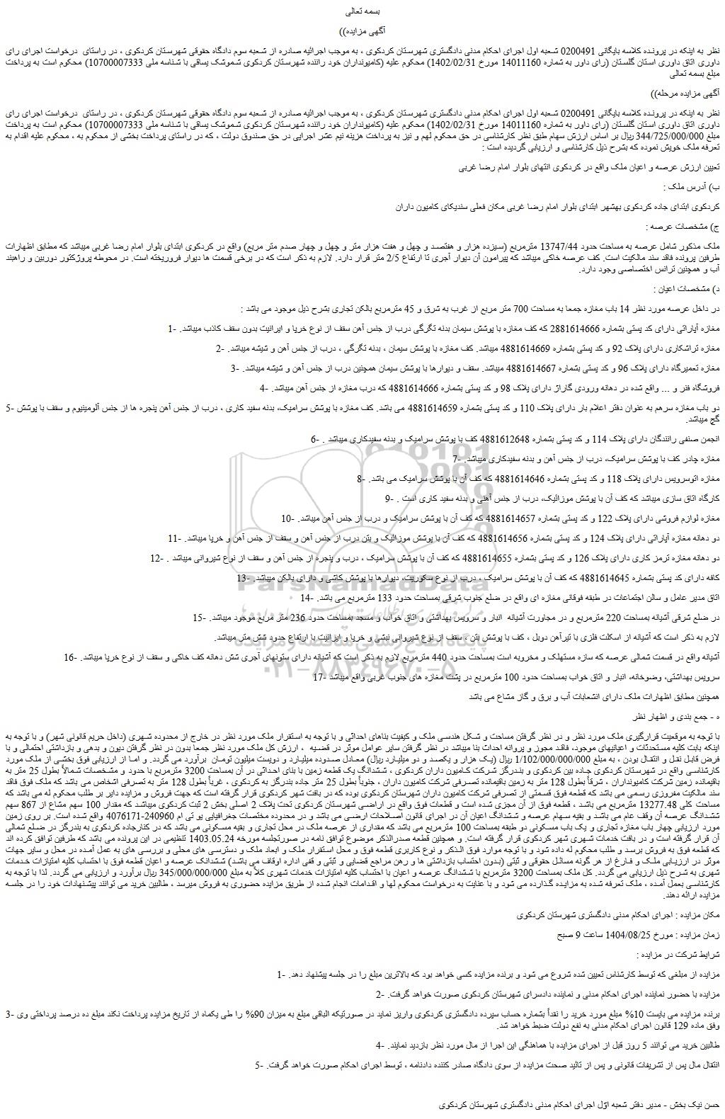 مکان مزایده : اجرای احکام مدنی دادگستری شهرستان کردکوی