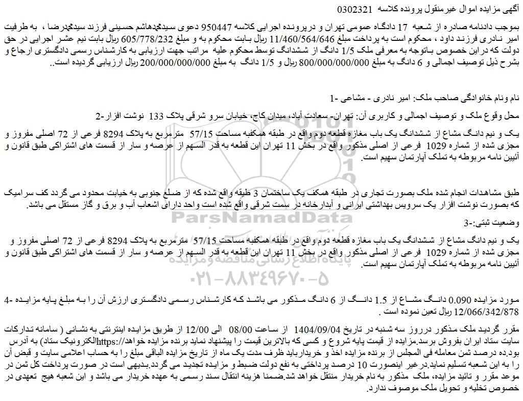 بموجب دادنامه صادره از شعبه  17 دادگاه عمومی تهران و درپرونده اجرایی کلاسه 950447 دعوی سیدمحمدهاشم حسینی فرزند سیدمحمدرضا ،  به طرفیت امیر نادری فرزند داود ، محکوم است به پرداخت مبلغ 11/460/564/646 ریال بابت محکوم به و مبلغ 605/778/232 ریال بابت نیم عشر اجرایی در حق دولت که دراین خصوص باتوجه به معرفی ملک 1/5 دانگ از ششدانگ توسط محکوم علیه  مراتب جهت ارزیابی به کارشناس رسمی دادگستری ارجاع و بشرح ذیل توصیف اجمالی و 6 دانگ به مبلغ 800/000/000/000 ریال و 1/5 دانگ  به مبلغ 200/000/000/000 ریال ارزیابی گردیده است..