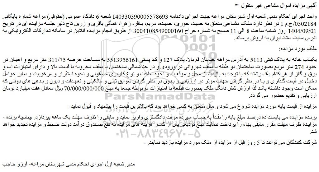 واحد اجرای احکام مدنی شعبه اول شهرستان مراغه جهت اجرای دادنامه 140330390005578693 شعبه 6 دادگاه عمومی (حقوقی) مراغه شماره بایگانی 0302184/ج.م 1 در نظر دارد ملک مشاعی متعلق به حمید، حوری، حمیده، مریم، باقر، زهرا، همگی باقری و زرین تاج دلیر جلسه مزایده ای در تاریخ 1404/09/01 روز شنبه ساعت 8 الی 11 صبح به شماره حراج 3004108549000160 از طریق انجام مزایده آنلاین در سامانه تدارکات الکترونیکی به آدرس سایت ستاد ایران به فروش برساند.