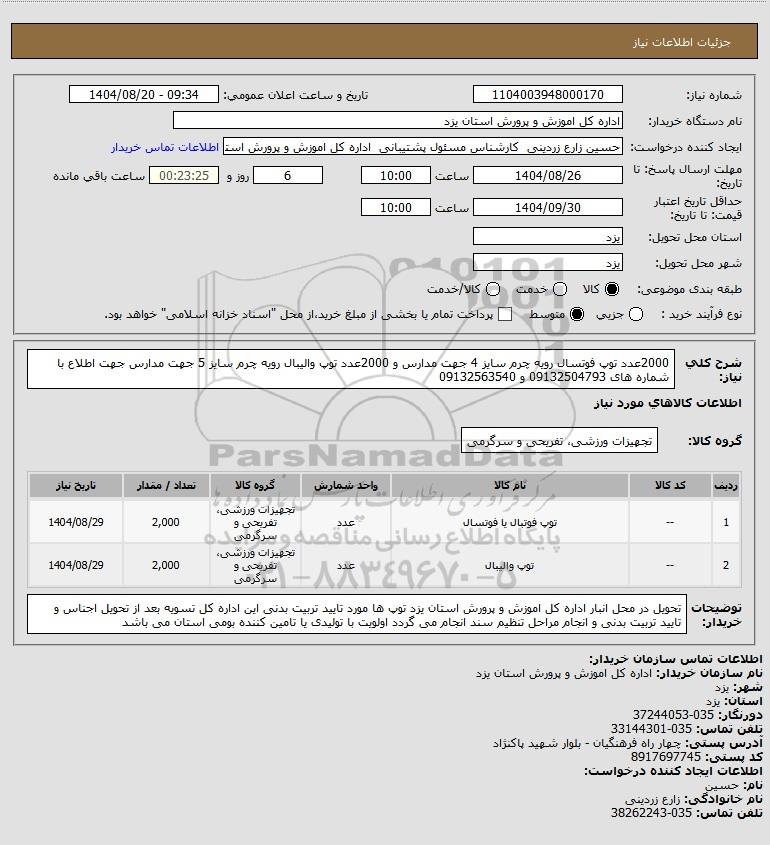 | 1 | -- | توپ فوتبال یا فوتسال | عدد | تجهیزات ورزشی، تفریحی و سرگرمی | 2,000 | 1404/08/29 |