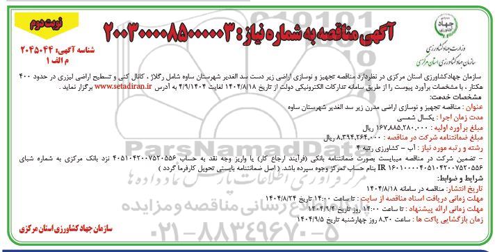 سازمان جهاد کشاورزی استان مرکزی در نظر دارد مناقصه تجهیز و نوسازی اراضی زیر دست سد الغدیر شهرستان ساوه شامل رگلاژ، کانال کنی و تسطیح اراضی لیزری در حدود 400 هکتار ، با مشخصات برآورد پیوست را از طریق سامانه تدارکات الکترونیکی دولت از تاریخ 1404.08.18 لغایت 1404.9.4 به آدرس ستاد ایلران برگزار نماید .