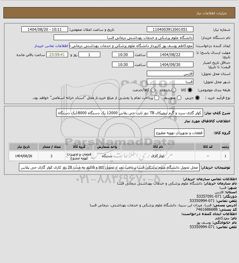 توضیحات خریدار:محل تحویل دانشگاه علوم پزشکی فسا پرداخت بعد از تحویل کالا و فاکتور به مدت 20 روز کاری کولر گازی جی پلاس