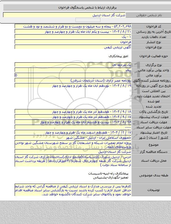 پروژه انجام تعمیرات شبکه و انشعابات گاز در سطح شهرستان مشگین شهر نواحی وروستاهای تابعه.