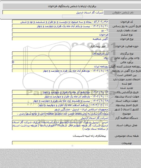 این مناقصه در استان مناقصات استان اردبیل با دسته بندی های صنفی و تخصصی پیمانکاری نفت و گاز و پتروشیمی برگزار میشود.
