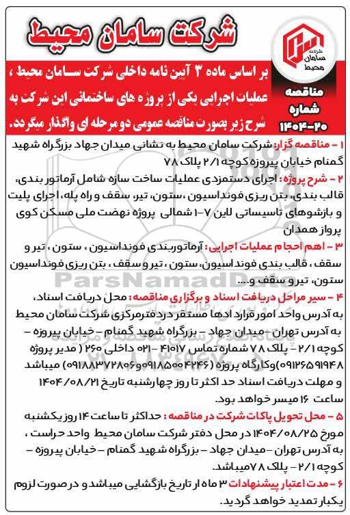 بر اساس ماده 3 آیین نامه داخلی شرکت سامان محیط ، عملیات اجرایی یکی از پروژه های ساختمانی این شرکت به شرح زیر بصورت مناقصه عمومی دو مرحله ای واگذار می گردد.