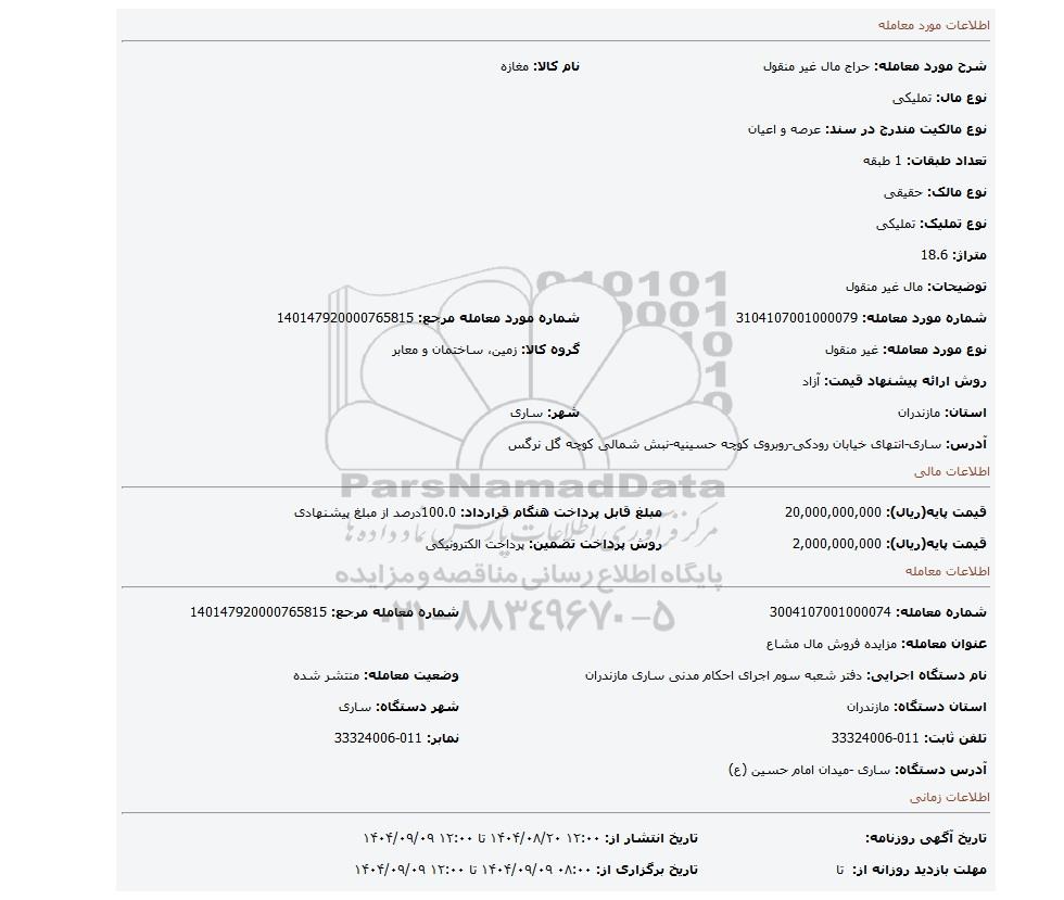 مزایده عمومی مزایده مال غیر منقول برگزار میگردد. از کلیه افراد متخصص و شرکتهای واجد شرایط دعوت به عمل میآید تا در این مزایده با کد خبرگزاری پارس نماد : 9834311 شرکت نمایند تاریخ شروع مزایده : 1404/08/20 مهلت شرکت در مزایده: تا پایان روز 1404/09/09 مکان برگزاری اموال واگذاری استانهای مازندران و دستهبندیهای مربوط به این حراجی املاک و زمین میباشد.