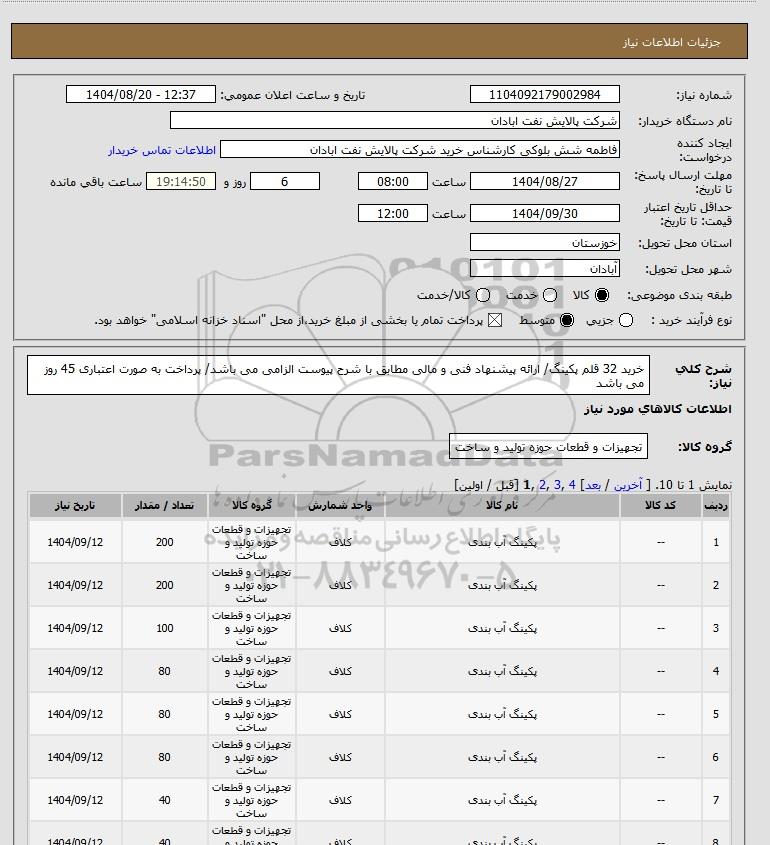 شرح کلی نیاز: خرید 32 قلم پکینگ/ ارائه پیشنهاد فنی و مالی مطابق با شرح پیوست الزامی می باشد/ پرداخت به صورت اعتباری 45 روز می باشد