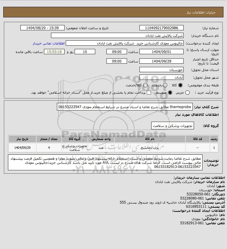 شرح کلی نیاز: thermoprobe مطابق شرح تقاضا و اسناد مندرج در شرایط استعلام محمدی 06153223547