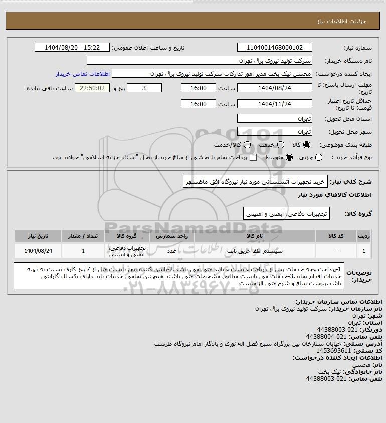 | 1 | -- | سیستم اطفا حریق ثابت | عدد | تجهیزات دفاعی، ایمنی و امنیتی | 1 | 1404/08/24 |