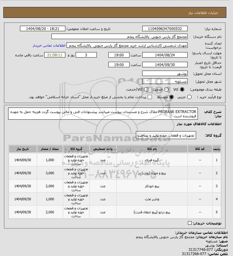 شرح کلی نیاز: PROPANE EXTRACTOR-ملاک شرح و مستندات پیوست میباشد پیشنهادات فنی و مالی پیوست گردد هزینه حمل به عهده فروشنده است