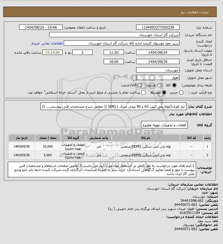 شرح کلی نیاز: نیاز فوری//لوله پلی اتیلن 63 و 90 میلی متری SDR11 (( مطابق شرح مشخصات فنی پیوستی... ))